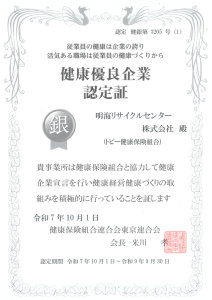 このたび当社は、従業員の健康づくりへの積極的な取組みが評価され、 「健康優良企業認定(銀の認定)」を2年連続で取得いたしました。 今後も社員の健康を大切にし、一人ひとりが心身ともに健康で働ける職場環境づくりを進めてまいります。